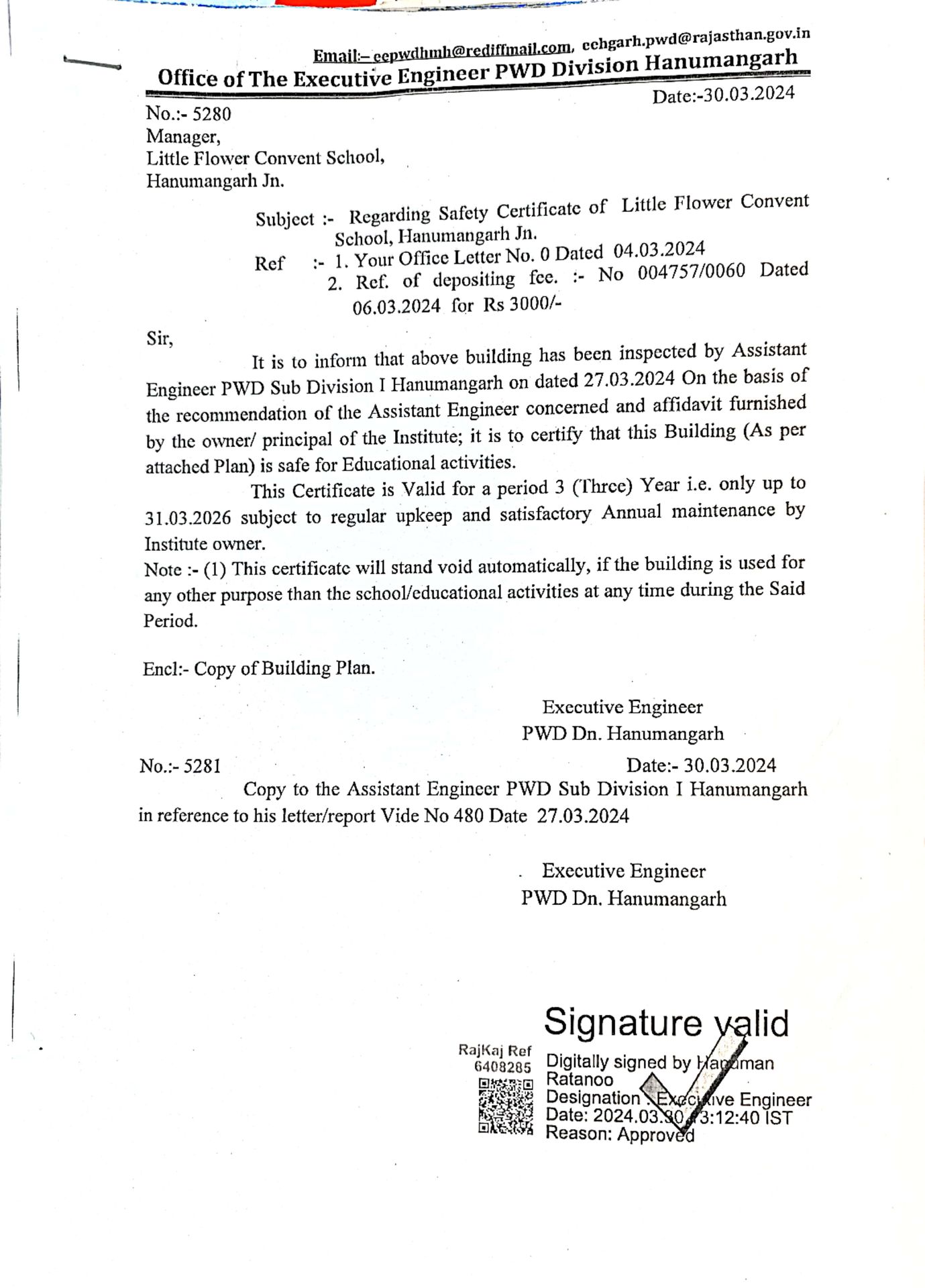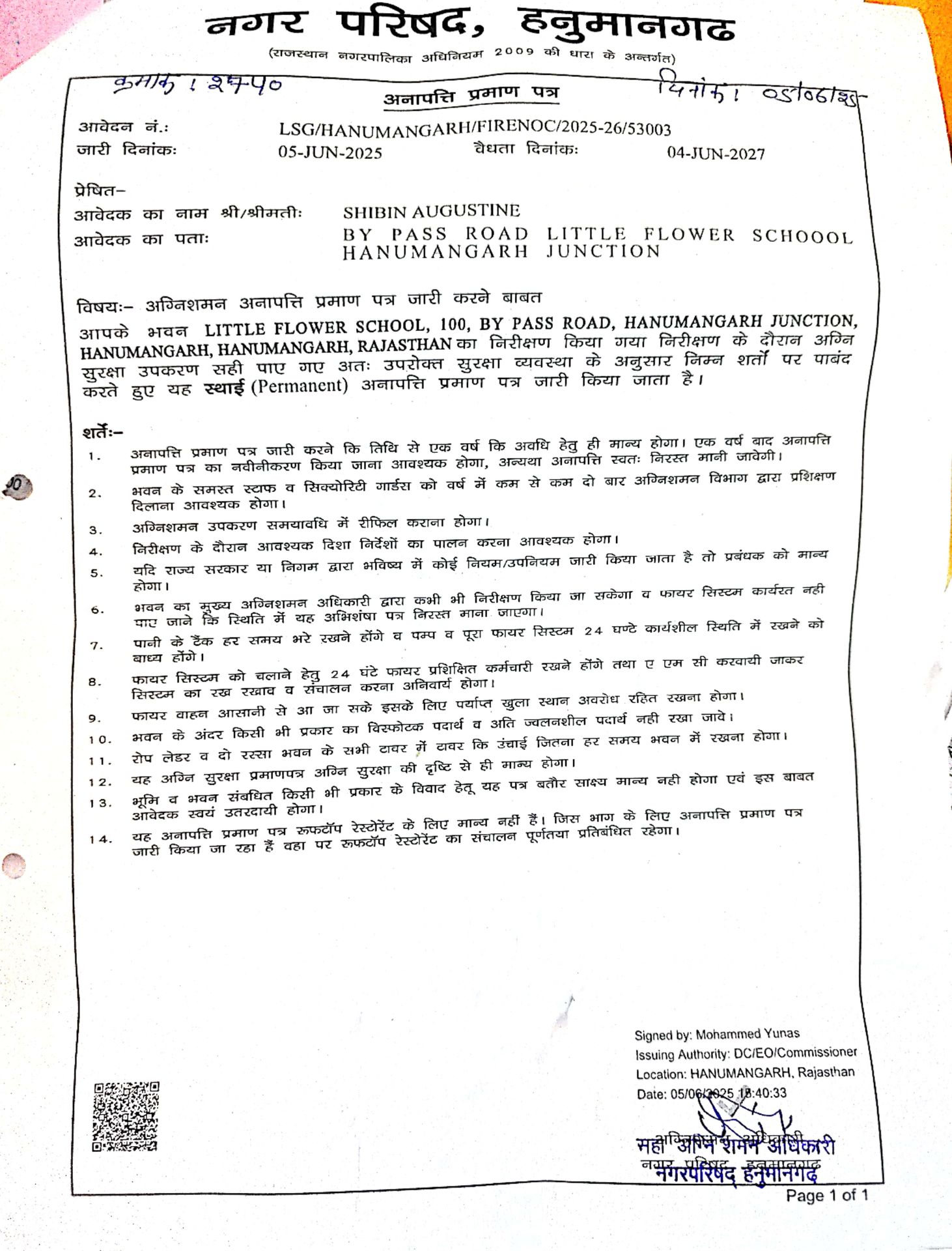 This certificate confirms that our school building meets all structural safety norms set by the authorities.